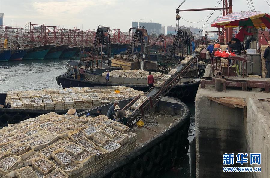 1月1日,滿載歸來的漁船陸續(xù)駛進(jìn)港灣,工人們?cè)谛遁d漁獲。新華社記者潘強(qiáng)攝