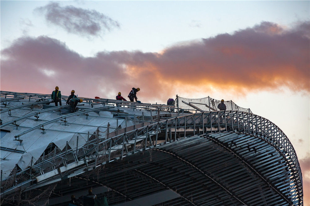 2019年1月13日,北京大興機(jī)場(chǎng)航站樓頂部最中央,一個(gè)工人正在進(jìn)行驗(yàn)收工作。陳國(guó)亨/視覺(jué)中國(guó)