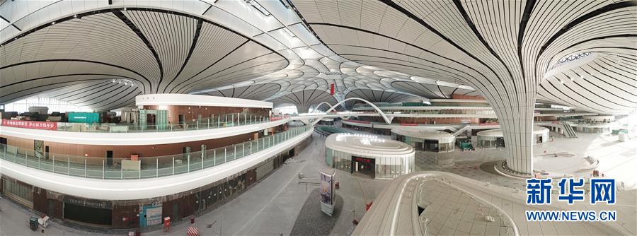 這是6月14日無人機(jī)拍攝的北京大興國際機(jī)場航站樓內(nèi)景(全景拼接照片)。新華社記者才揚攝