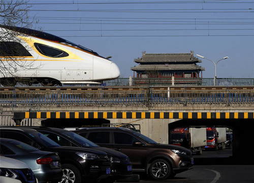 2019年1月25日,一列“復(fù)興號(hào)”動(dòng)車(chē)組列車(chē)在北京永定門(mén)城樓附近的京津城際鐵路上行駛。新華社記者邢廣利攝