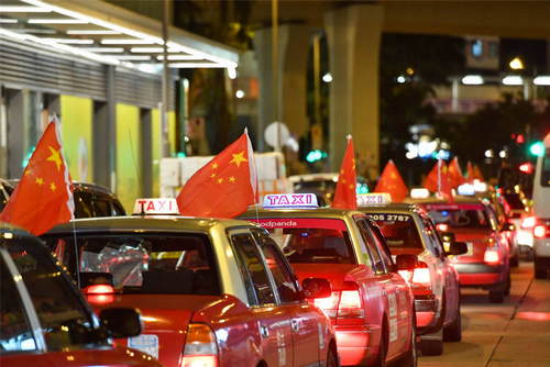 2019年8月23日,從香港港島筲箕灣出發(fā)的張掛中國(guó)國(guó)旗的出租車(chē)行駛在街道上。新華社記者劉大偉攝