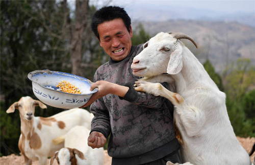2019年3月27日,在河南省盧氏縣沙河鄉(xiāng)果角村,村民任當(dāng)鋒在喂羊。41歲的任當(dāng)鋒曾多年在外打工,由于腰部有傷不能干重活。2018年,在知悉盧氏縣的金融扶貧政策后,任當(dāng)鋒返鄉(xiāng)創(chuàng)業(yè),用貸來(lái)的5萬(wàn)元無(wú)擔(dān)保無(wú)抵押小額貸款,購(gòu)買(mǎi)了38只羊,從打工仔變成了一個(gè)羊倌。 新華社記者李嘉南攝