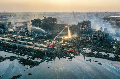 2019年3月23日拍攝的江蘇省鹽城市響水縣天嘉宜化工有限公司“3·21”特別重大爆炸事故現(xiàn)場(chǎng)(無(wú)人機(jī)照片)。新華社記者李博攝