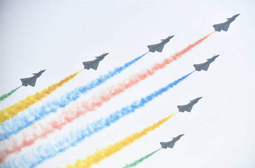2019年10月21日,在吉林長(zhǎng)春舉行的慶祝人民空軍成立70周年航空開(kāi)放活動(dòng)上,空軍八一飛行表演隊(duì)殲-10飛機(jī)編隊(duì)從靜態(tài)展示的新型雷達(dá)上空飛過(guò)。新華社發(fā)(萬(wàn)全攝)