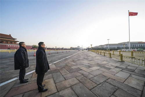 2019年12月7日,新任香港特區(qū)政府警務(wù)處處長(zhǎng)鄧炳強(qiáng)(右)率香港警務(wù)處代表團(tuán)來(lái)到北京天安門(mén)廣場(chǎng),觀看升國(guó)旗儀式。新華社記者殷剛攝