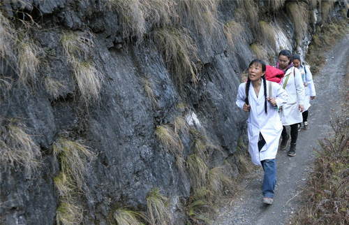 2019年1月13日,在云南省貢山縣丙中洛鎮(zhèn),管延萍(左)與同事走在進(jìn)村的山路上。管延萍從經(jīng)濟(jì)發(fā)達(dá)的珠三角地區(qū),自愿到深度貧困地區(qū)云南怒江傈僳族自治州參加?xùn)|西部扶貧協(xié)作,并主動(dòng)申請(qǐng)將期限從半年延長(zhǎng)至3年。 新華社記者張加揚(yáng)攝