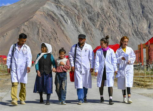 2019年7月7日,新疆塔什庫(kù)爾干塔吉克自治縣達(dá)布達(dá)爾鄉(xiāng)熱斯喀木村村醫(yī)發(fā)爾亞特·塔西白克(右三)與來(lái)自鄉(xiāng)衛(wèi)生院的醫(yī)務(wù)人員來(lái)到熱斯喀木村易地扶貧搬遷安置點(diǎn)出診。從過(guò)去騎著馬深入大山牧場(chǎng)巡診,到現(xiàn)在定期前往集中居住點(diǎn)上門(mén)服務(wù);從過(guò)去幾種簡(jiǎn)單的常備藥,到如今種類(lèi)豐富的各類(lèi)藥品……新疆牧區(qū)的醫(yī)療條件和水平大幅提升,牧民享受到越來(lái)越多、越來(lái)越便利的醫(yī)療惠民服務(wù)。新華社記者胡虎虎攝