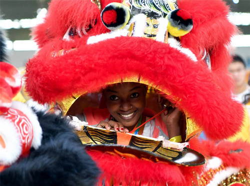 2019年10月28日,來(lái)自印度洋島國(guó)科摩羅的拉一莎在河南省鄭州西亞斯學(xué)院體驗(yàn)舞獅。新華社記者李嘉南攝