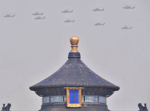 2019年10月1日,慶祝中華人民共和國(guó)成立70周年大會(huì)在北京天安門(mén)廣場(chǎng)隆重舉行。這是從天壇公園拍攝的陸航突擊梯隊(duì)。新華社記者賀長(zhǎng)山攝