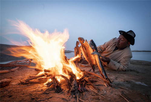 2019年4月11日,在新疆尉犁縣羅布人村寨里,羅布人阿木東·艾不東在塔里木河畔烤魚(yú)。新華社記者趙戈攝