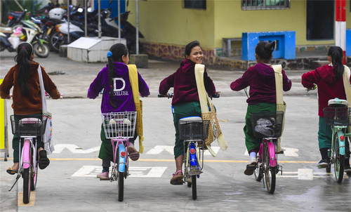 2019年3月8日,在云南省瑞麗市姐相鄉(xiāng)銀井村,銀井小學(xué)幾名緬籍學(xué)生騎車(chē)回家,跨過(guò)銀井邊防口岸國(guó)境線。每天清晨,都有一群孩子通過(guò)銀井邊防站,從緬甸來(lái)到瑞麗市銀井小學(xué)讀書(shū)。新華社記者李曉果攝