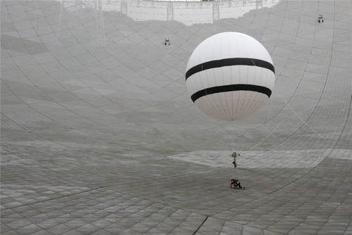 2019年8月30日,在貴州省平塘縣,“微重力蜘蛛人”在500米口徑球面射電望遠(yuǎn)鏡(FAST)上進(jìn)行首次巡檢實(shí)驗(yàn)。FAST調(diào)試組于2017年底開(kāi)始研制“微重力蜘蛛人”,該方案使用一個(gè)直徑7.6米的氦氣球?qū)⒆鳂I(yè)人員體重減少到FAST反射面板能夠承受的重量,使作業(yè)者能夠到達(dá)望遠(yuǎn)鏡反射面任意地方執(zhí)行巡檢和維護(hù)作業(yè)。新華社記者歐東衢攝
