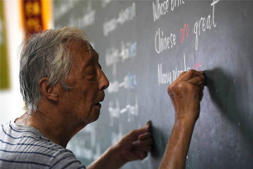 2019年7月30日,葉連平在“留守未成年人之家”教室里為第二天的英語(yǔ)課準(zhǔn)備板書(shū)。暑期伊始,在安徽省和縣烏江鎮(zhèn)卜陳村“留守未成年人之家”,92歲的退休教師葉連平又開(kāi)始了暑假的忙碌。新華社發(fā)(黃博涵 攝)