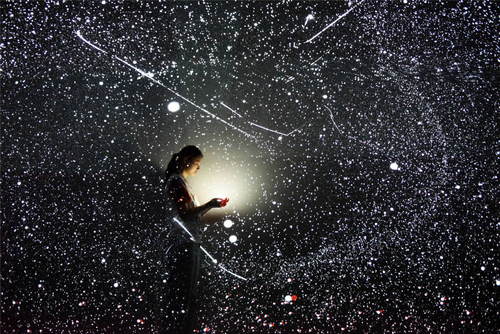 2019年5月28日, 參觀者在貴州省貴陽(yáng)市舉辦的2019中國(guó)國(guó)際大數(shù)據(jù)產(chǎn)業(yè)博覽會(huì)“追夢(mèng)·未來(lái)”數(shù)字藝術(shù)特展上觀看和體驗(yàn)藝術(shù)作品《宇宙深空》。新華社記者楊文斌攝