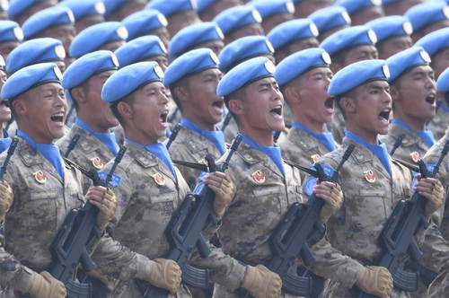 2019年10月1日,慶祝中華人民共和國(guó)成立70周年大會(huì)在北京天安門(mén)廣場(chǎng)隆重舉行。這是維和部隊(duì)方隊(duì)接受檢閱。新華社記者劉大偉攝