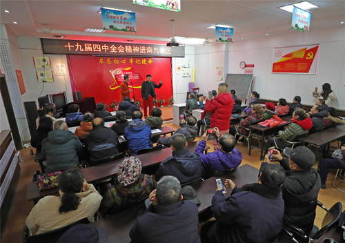 2019年11月26日,遼寧省十九屆四中全會(huì)精神曲藝宣講小分隊(duì)成員在沈陽(yáng)市南九社區(qū)活動(dòng)室表演節(jié)目《大和小》。新華社記者楊青攝