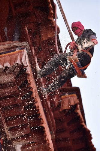2019年1月23日,在黑龍江省漠河市嫩林線674公里處,加格達(dá)奇工務(wù)段橋隧工杜志彪在進(jìn)行涵洞除冰作業(yè)。新華社記者才揚(yáng)攝