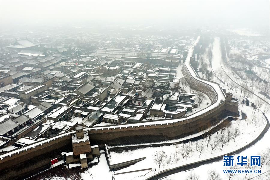 1月5日拍攝的平遙古城城墻與護(hù)城河(無人機(jī)照片)。新華社記者詹彥攝