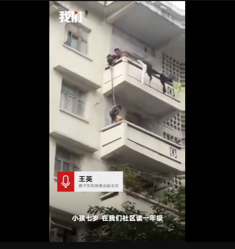小男孩被大人們用繩子系著腰,晃晃悠悠地吊下三樓遮雨平臺后,勇敢地走向貓,將其抱起,接著又被5樓的奶奶等人晃晃悠悠地吊起往上拉,小男孩全程表情木然,絲毫未見緊張害怕。萬幸的是,最終男孩平安并順利完成任務。