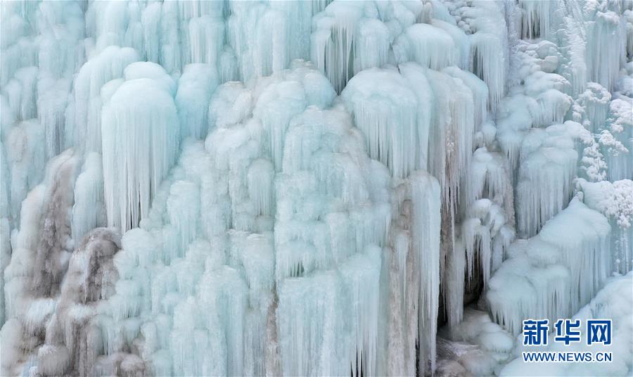 這是1月7日拍攝的賀蘭山巖畫景區(qū)內的冰瀑景觀(無人機照片)。近日,寧夏賀蘭山巖畫景區(qū)內,自然山泉凍結冰瀑和人造冰瀑景觀相結合,形成多處冰瀑景觀,山間形態(tài)各異的冰掛、冰柱鬼斧神工,蔚為壯觀,吸引眾多游客前來觀賞。  新華社記者 王鵬 攝