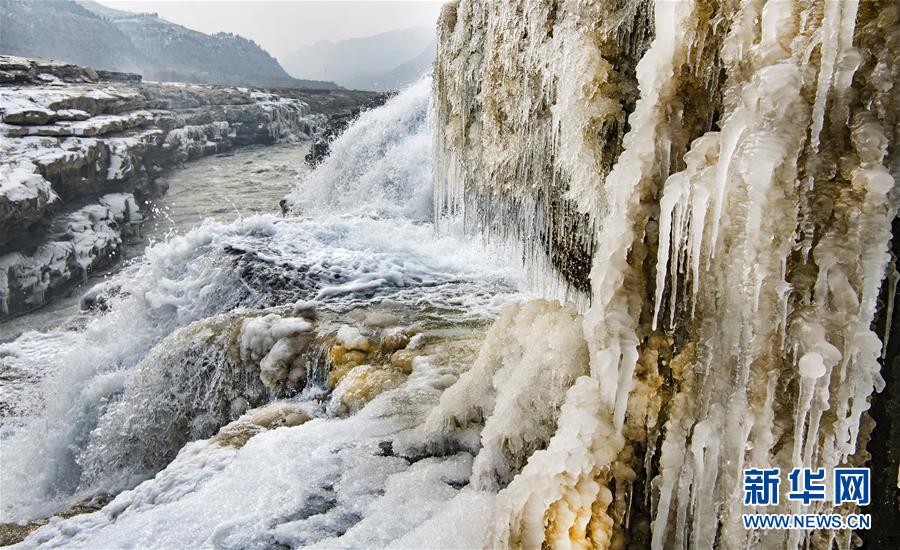 1月12日,陜西黃河壺口瀑布景區(qū)內(nèi)的冰瀑與流動的瀑布形成一幅壯麗的圖畫。新華社記者陶明攝