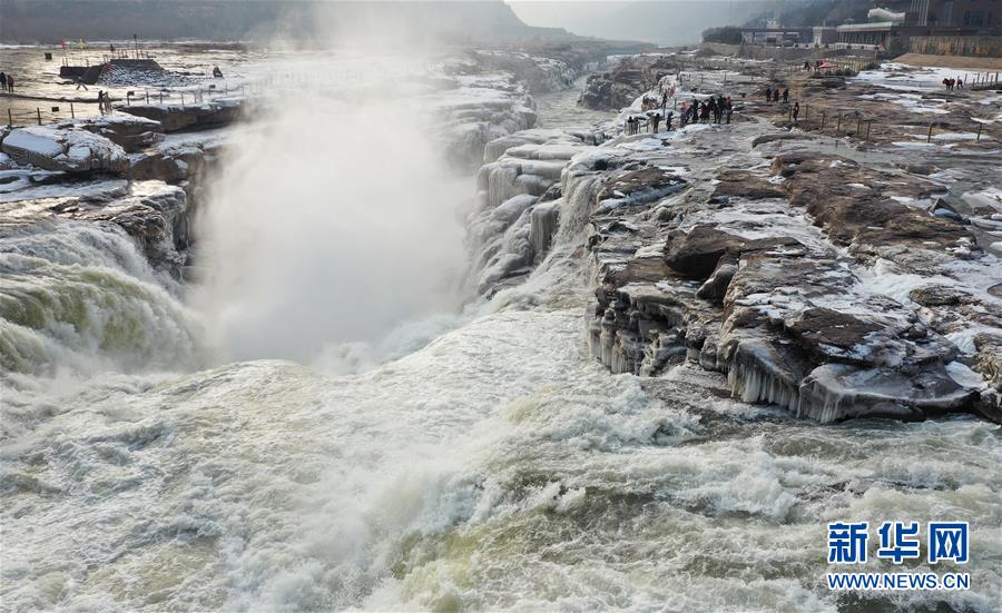 1月12日拍攝的黃河壺口瀑布的“水底冒煙”景觀(無(wú)人機(jī)照片)。新華社記者陶明攝