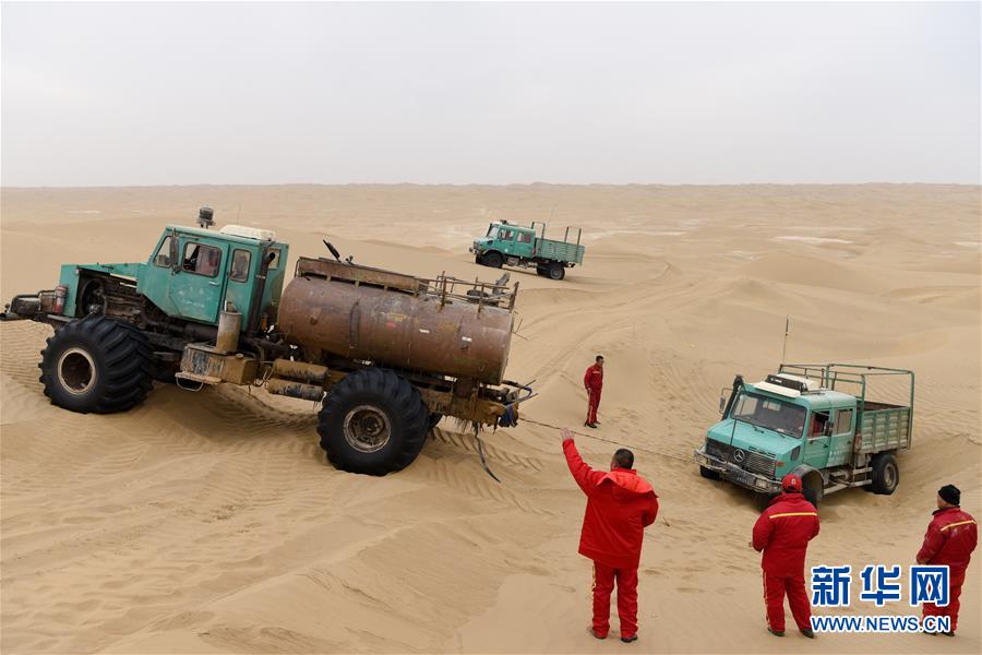 一輛測量作業(yè)車陷在沙坑中,水罐車進(jìn)行營救(1月13日攝)。地球物理勘探是油氣開發(fā)的第一步,相當(dāng)于給地球做CT。物探工人按照嚴(yán)格的測線部署,在相應(yīng)位置鉆井,然后實施地震,采集地震波數(shù)據(jù)。科研人員通過數(shù)據(jù)組成的“CT片”,就能夠清晰地“看”到地下的地質(zhì)結(jié)構(gòu),判斷哪里埋藏有石油或者天然氣。2019年10月,東方地球物理勘探有限責(zé)任公司塔里木物探處2113隊進(jìn)入新疆塔克拉瑪干沙漠腹地,開始中古14-21、塔中2兩個區(qū)塊的三維地震勘探。近2000名物探工人將在1000平方公里的范圍內(nèi)一直工作到2020年4月,這也意味著他們將在塔克拉瑪干沙漠腹地連續(xù)度過第14個除夕夜。蘊藏著豐富石油天然氣資源的新疆塔克拉瑪干沙漠有“死亡之?!敝Q,氣候干燥,年降水量在50毫米以下,冬季地表最低溫度超過零下30攝氏度,是世界油氣勘探難度最大的地區(qū)之一。為避開風(fēng)季,物探工人每年9、10月份進(jìn)入沙漠,一直工作到來年4月,夜以繼日與黃沙、嚴(yán)寒為伴,用辛勤的汗水,為祖國找油找氣。新華社記者丁磊攝