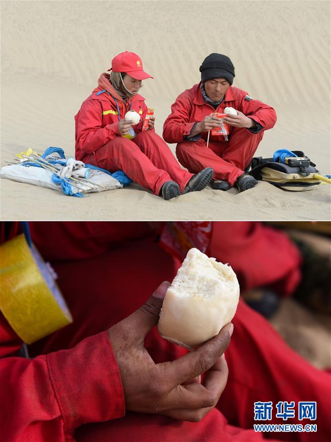 這是一張拼版圖片:上圖為測量工周國燕(左)和丈夫杞朝金在沙漠中解決午餐(1月13日攝);下圖為測量工周國燕在吃冰涼的饅頭(1月13日攝)。地球物理勘探是油氣開發(fā)的第一步,相當(dāng)于給地球做CT。物探工人按照嚴(yán)格的測線部署,在相應(yīng)位置鉆井,然后實施地震,采集地震波數(shù)據(jù)??蒲腥藛T通過數(shù)據(jù)組成的“CT片”,就能夠清晰地“看”到地下的地質(zhì)結(jié)構(gòu),判斷哪里埋藏有石油或者天然氣。2019年10月,東方地球物理勘探有限責(zé)任公司塔里木物探處2113隊進(jìn)入新疆塔克拉瑪干沙漠腹地,開始中古14-21、塔中2兩個區(qū)塊的三維地震勘探。近2000名物探工人將在1000平方公里的范圍內(nèi)一直工作到2020年4月,這也意味著他們將在塔克拉瑪干沙漠腹地連續(xù)度過第14個除夕夜。蘊(yùn)藏著豐富石油天然氣資源的新疆塔克拉瑪干沙漠有“死亡之海”之稱,氣候干燥,年降水量在50毫米以下,冬季地表最低溫度超過零下30攝氏度,是世界油氣勘探難度最大的地區(qū)之一。為避開風(fēng)季,物探工人每年9、10月份進(jìn)入沙漠,一直工作到來年4月,夜以繼日與黃沙、嚴(yán)寒為伴,用辛勤的汗水,為祖國找油找氣。新華社記者丁磊攝