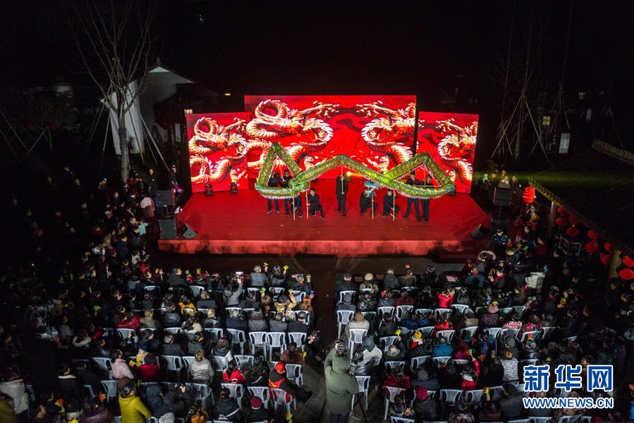1月14日,杭州市余杭區(qū)中泰街道中橋村的文化公園內在進行“我們的村晚”舞龍表演,吸引了大批當?shù)匕傩沼^看(無人機照片)。臨近春節(jié),浙江省杭州市余杭區(qū)中泰街道各村社的文化禮堂紛紛上演“我們的村晚”。老百姓自編、自導、自演為主的“土味”聯(lián)歡會因接地氣、親情濃而深受當?shù)匕傩盏南矏?,成為當?shù)剜l(xiāng)村百姓的新年迎春“文化大餐”。近年來,中泰街道以文化振興助推鄉(xiāng)村振興。目前,中泰街道下屬各村陸續(xù)建成文化禮堂7個、社區(qū)文化家園2個,努力培育和挖掘出一批鄉(xiāng)土文化人才及原創(chuàng)作品,2019年全年開展各類鄉(xiāng)村社區(qū)惠民文體活動累計180余場次。新華社記者徐昱攝