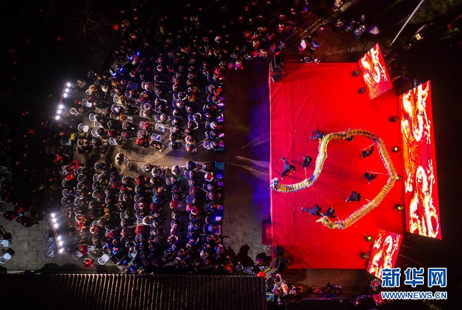 1月14日,杭州市余杭區(qū)中泰街道中橋村的文化公園內(nèi)在進(jìn)行“我們的村晚”舞龍表演,吸引了大批當(dāng)?shù)匕傩沼^看(無人機(jī)照片)。臨近春節(jié),浙江省杭州市余杭區(qū)中泰街道各村社的文化禮堂紛紛上演“我們的村晚”。老百姓自編、自導(dǎo)、自演為主的“土味”聯(lián)歡會(huì)因接地氣、親情濃而深受當(dāng)?shù)匕傩盏南矏?,成為?dāng)?shù)剜l(xiāng)村百姓的新年迎春“文化大餐”。近年來,中泰街道以文化振興助推鄉(xiāng)村振興。目前,中泰街道下屬各村陸續(xù)建成文化禮堂7個(gè)、社區(qū)文化家園2個(gè),努力培育和挖掘出一批鄉(xiāng)土文化人才及原創(chuàng)作品,2019年全年開展各類鄉(xiāng)村社區(qū)惠民文體活動(dòng)累計(jì)180余場(chǎng)次。新華社記者徐昱攝