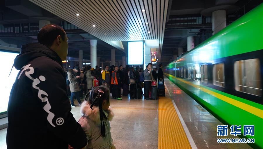 1月3日,卞菁值乘的動(dòng)車(chē)到站,朱梓芮(前右)和父親尋找卞菁的身影。新華社記者 胡晨歡 攝