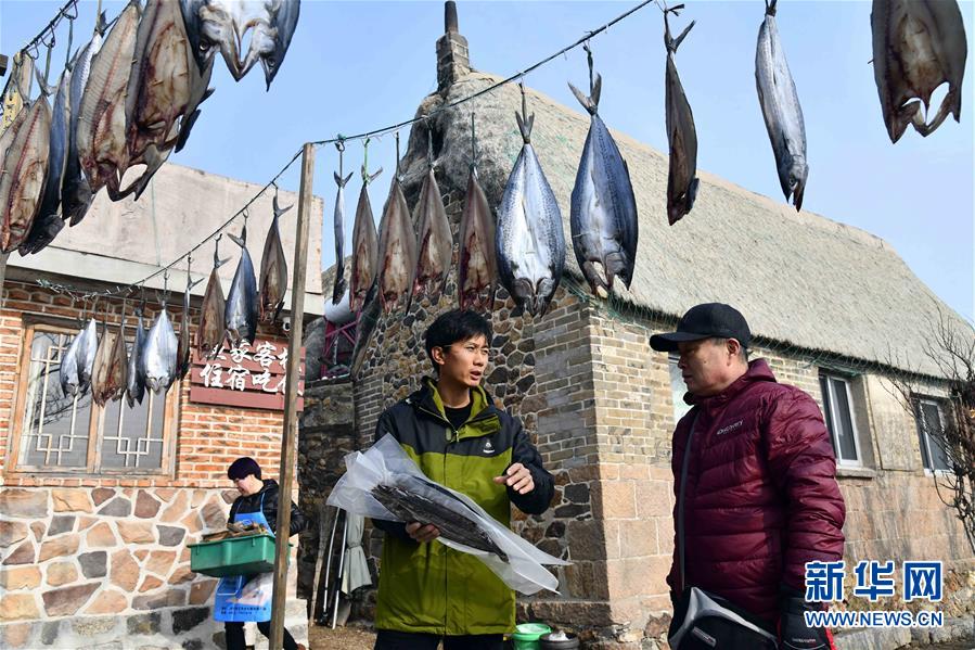 在榮成市煙墩角村,于海洋(中)向游客介紹自家晾曬的鲅魚(yú)(1月12日攝)。新華社記者 郭緒雷 攝