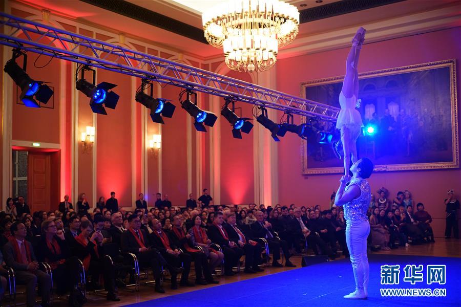 1月15日,在德國柏林,貴州省歌舞劇院藝術團的演員在晚會上表演雜技。 15日晚,2020年“歡樂春節(jié)”新春文藝晚會在德國柏林的紅色市政廳上演,中德兩國各界代表觀看演出,共慶中國農歷新年。 新華社記者 王勍 攝