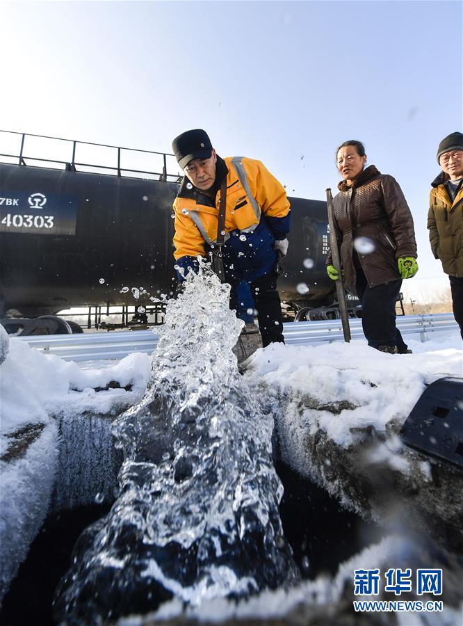 送水員黃衛(wèi)東調(diào)整輸水管位置,將水注入火炬溝乘降點的蓄水井內(nèi)(1月17日攝)。新華社記者 許暢 攝