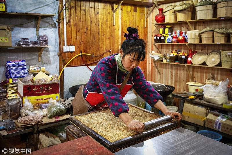 重慶江津區(qū)中山古鎮(zhèn)第十四屆 “千米長宴”民俗文化節(jié)盛大啟幕。上午10時(shí),中山古鎮(zhèn)老街人聲鼎沸,窄窄的青石板路打掃得干干凈凈,家家戶戶門口掛起喜慶的紅燈籠,老商鋪門口擺滿了米酒、烤糍粑、煙熏豆腐……此次“千米長宴”以“絲路情緣,‘?!现猩健睘橹黝}?!扒组L宴”期間,游客們不僅可以一雙筷子吃遍全街,還可欣賞到祈福祭祀、民俗拜年、“打盆上菜”等表演,同時(shí)還增設(shè)了以唱、跳、講故事的上菜方式情景演繹愛情主題的文化餐飲,展示富硒愛情宴的文化內(nèi)涵。圖為街坊們在頭天就開始準(zhǔn)備各種菜肴與小吃。