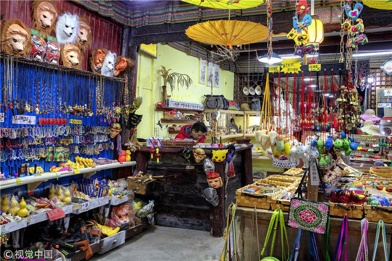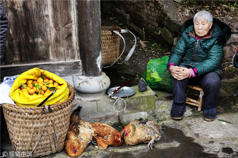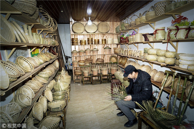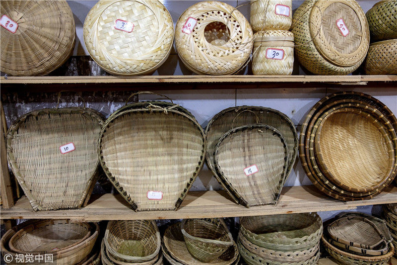 2019年1月26日,重慶中山古鎮(zhèn),880桌“千米長宴”5萬人共品年味。古鎮(zhèn)居民們編制的竹編制品。