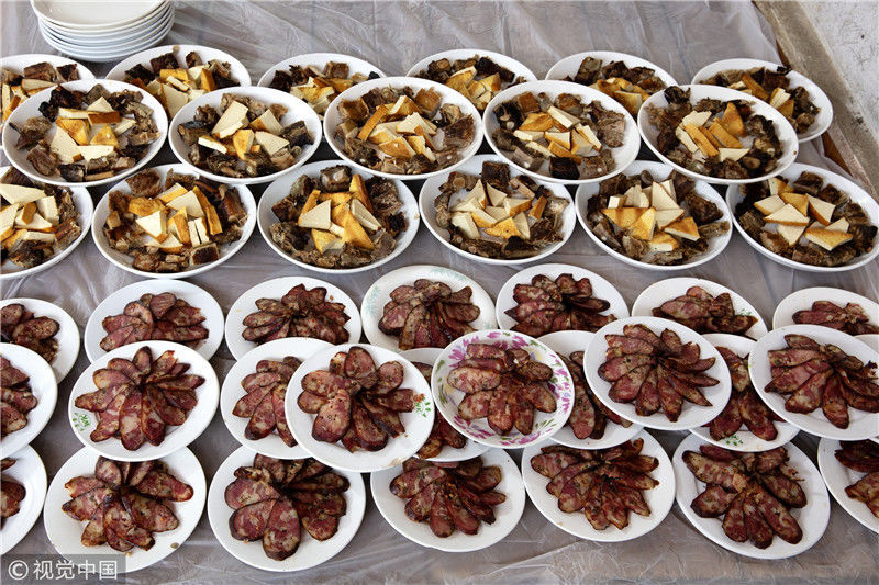 2019年1月26日,重慶中山古鎮(zhèn),880桌“千米長宴”5萬人共品年味。街坊們在頭天就開始準(zhǔn)備各種菜肴與小吃。