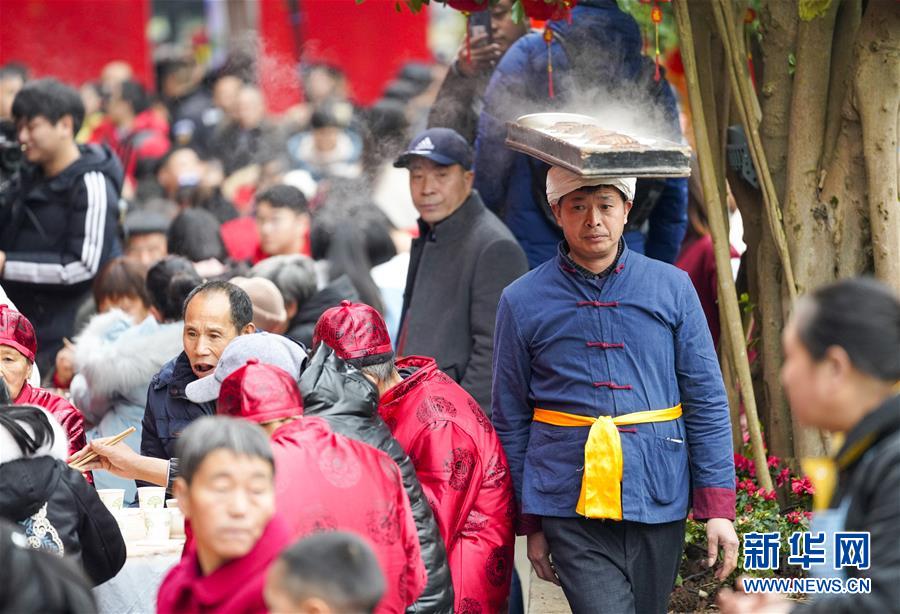 2019年1月26日,重慶中山古鎮(zhèn),880桌“千米長宴”5萬人共品年味。身著紅色對(duì)襟外套,光腳穿著草鞋的62歲老人楊光祥展示了他的絕活——“打盆上菜”。