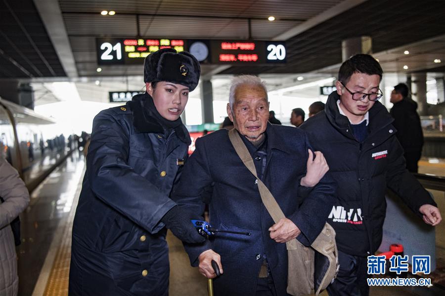吉如(左一)在西安北站的站臺(tái)上協(xié)助旅客乘降,確保旅客安全乘車(chē)(1月14日攝)。今年春運(yùn)列車(chē)開(kāi)行密度大,站臺(tái)崗位人員緊張,吉如時(shí)常被調(diào)到站臺(tái)進(jìn)行站臺(tái)服務(wù)工作。新華社記者陶明攝