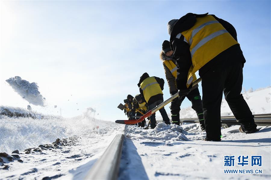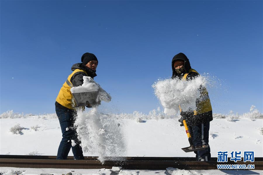 1月13日,白音庫(kù)倫綜合維修車間職工在作業(yè)點(diǎn)清理積雪。新華社記者劉磊攝