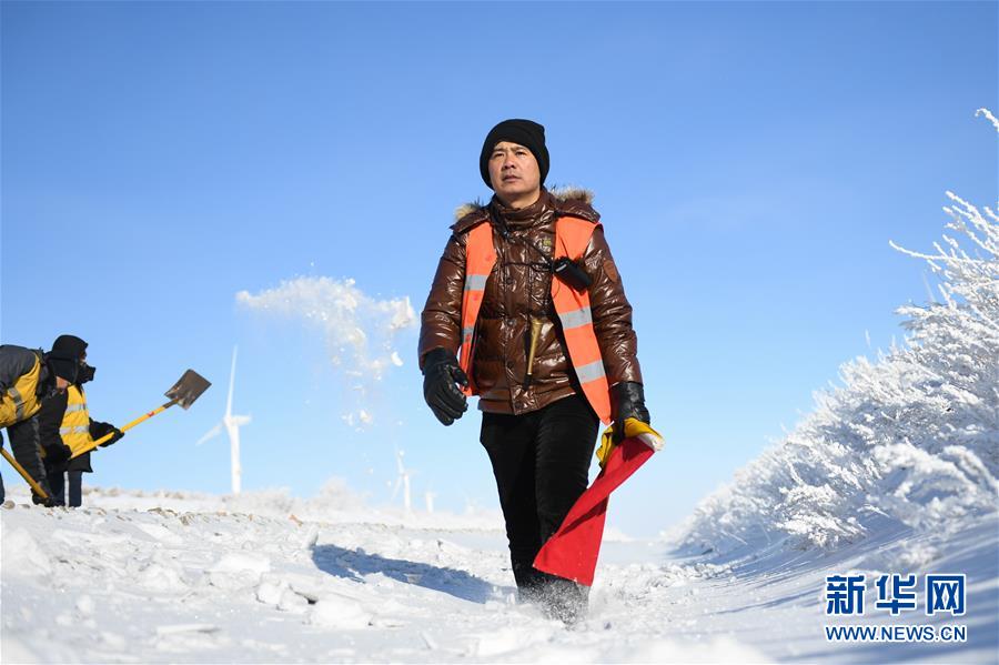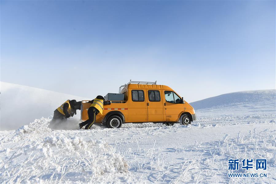 1月13日,車輛在途中打滑,白音庫(kù)倫綜合維修車間的職工們查看路況。新華社記者劉磊攝