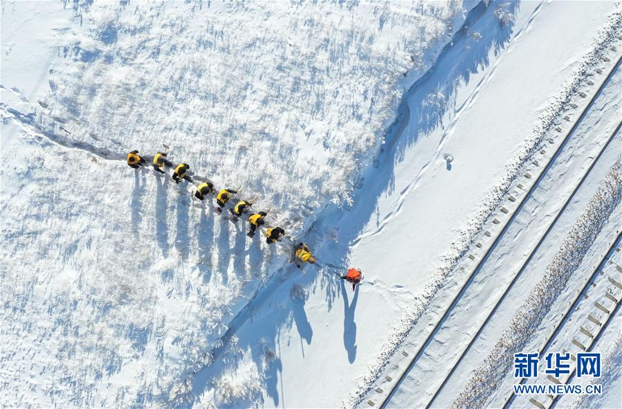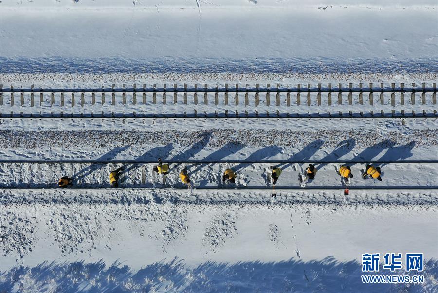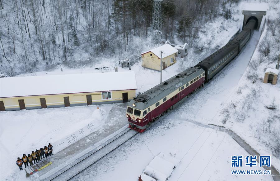 1月7日,西羅奇維修工隊(duì)工作人員在雪地上寫下“一路平安”為經(jīng)過(guò)的列車旅客送上祝福(無(wú)人機(jī)照片)。新華社記者王毓國(guó)攝