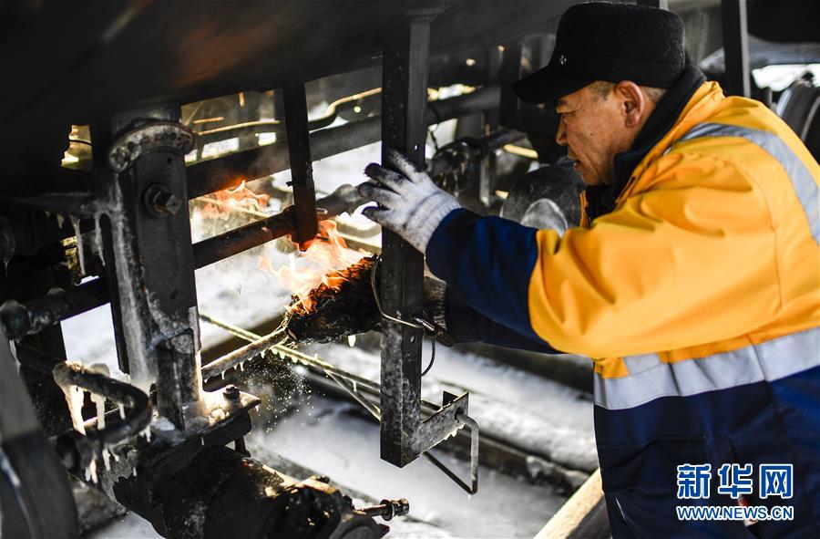 林海間的“送水小火車”調(diào)車員對(duì)“送水小火車”進(jìn)行出行前的檢查作業(yè)(1月17日攝)。新華社記者許暢攝