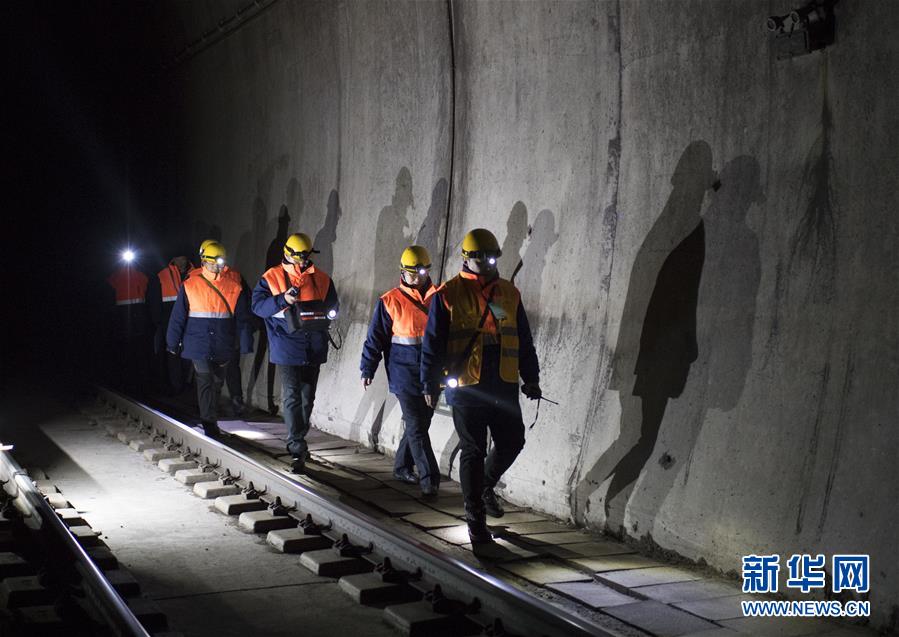 1月8日,西羅奇維修工隊(duì)工人們?cè)谖髁_奇嶺一號(hào)隧道附近等待列車經(jīng)過(guò)。新華社記者王毓國(guó)攝