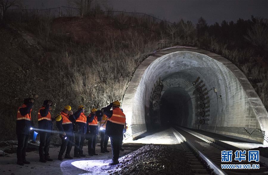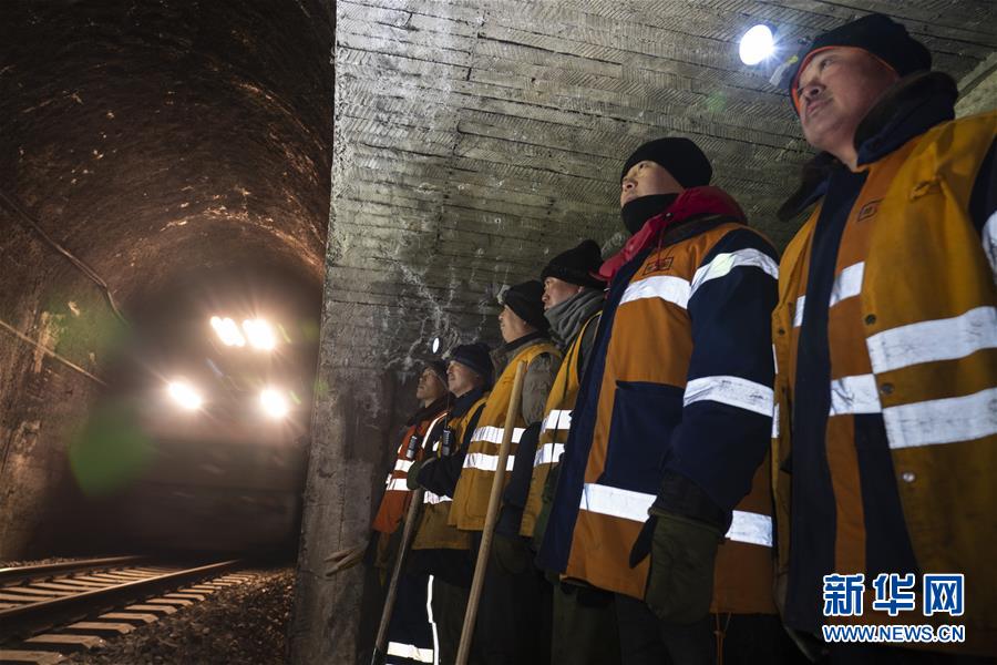 1月9日,在加格達(dá)奇工務(wù)段西羅奇嶺二號(hào)隧道,西羅奇維修工隊(duì)工作人員在避車洞內(nèi)躲避列車。新華社記者王毓國(guó)攝