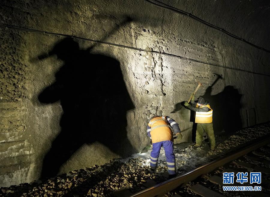 1月7日,在加格達(dá)奇工務(wù)段西羅奇嶺二號(hào)隧道,西羅奇維修工隊(duì)工作人員進(jìn)行隧道除冰作業(yè)。新華社記者王毓國(guó)攝