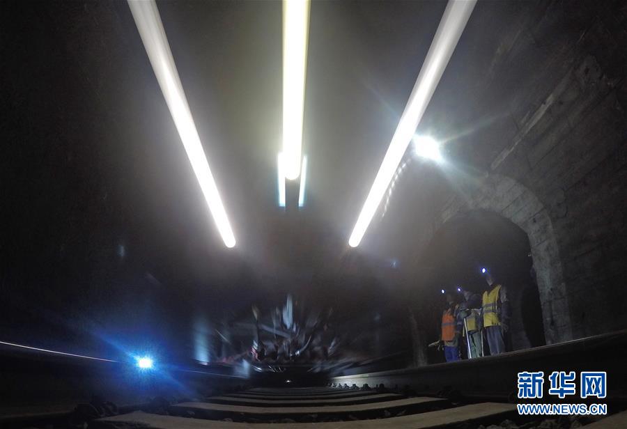 1月9日,在加格達(dá)奇工務(wù)段西羅奇嶺二號隧道,西羅奇維修工隊(duì)工作人員在避車洞內(nèi)躲避列車。新華社記者王毓國攝
