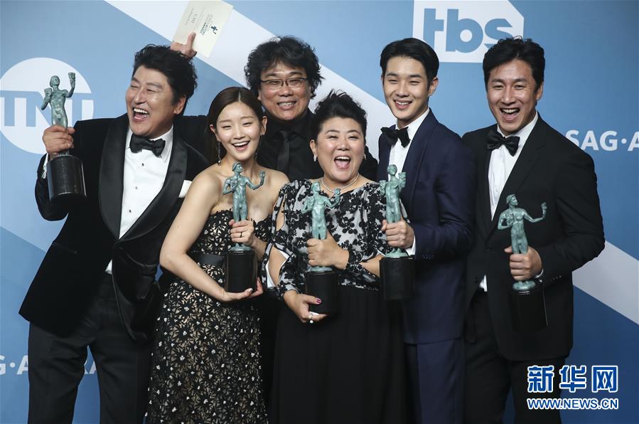 1月19日,在美國洛杉磯,韓國黑色喜劇片《寄生蟲》主創(chuàng)人員展示獎杯。 新華社記者 李穎 攝