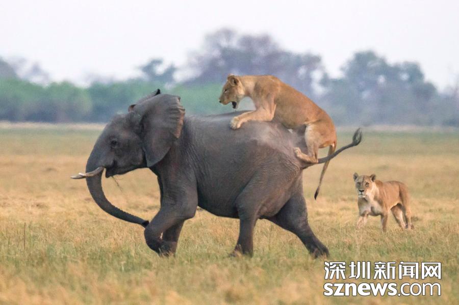 英國攝影師詹姆斯(James Gifford)在博茨瓦納喬貝國家公園拍到一群獅子獵食大象的精彩畫面。在詹姆斯的鏡頭下,一頭母獅跳到了一頭小象的背上想要將其拿下,但僅憑一己之力又不能做到。但當(dāng)母獅的后援抵達(dá)時(shí),象群也趕到了現(xiàn)場(chǎng)。最終,小象回到了象群中獲得庇護(hù),而獅群也不得不悻悻離去。