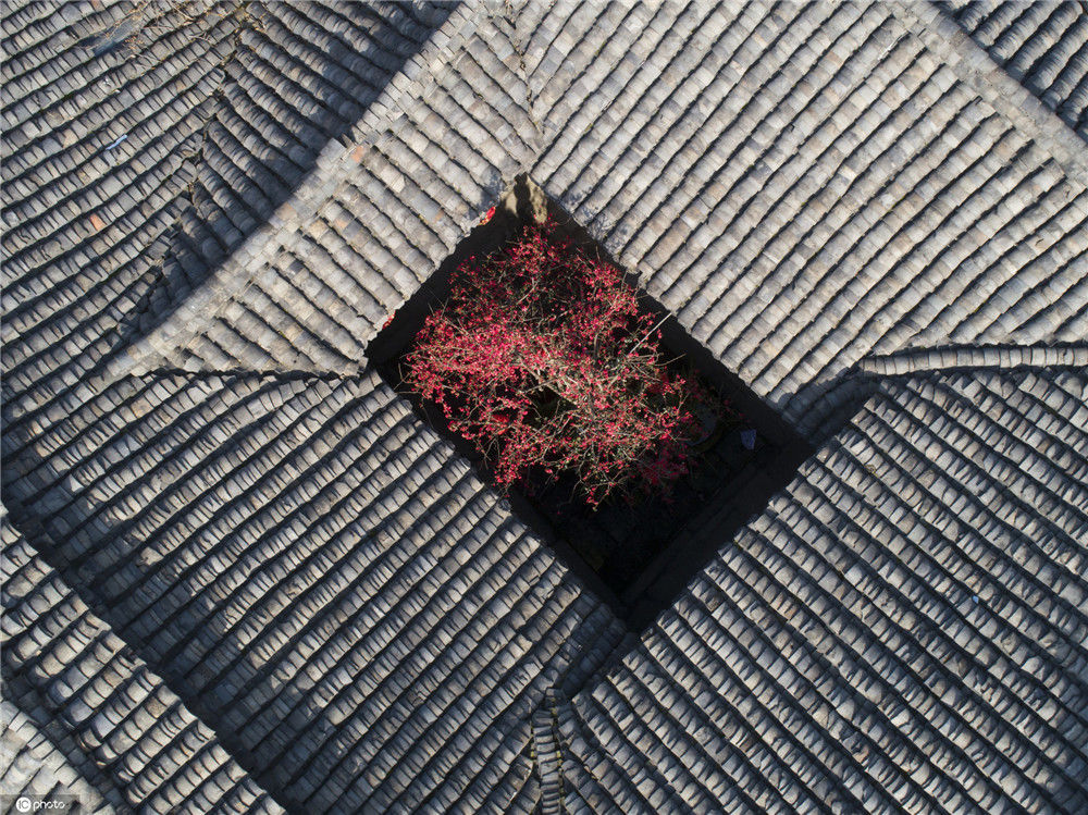 2020年2月21日,四川南充閬中古城中天樓旁,張家小院天井中的海棠在陽光中綻放(無人機(jī)拍攝)。